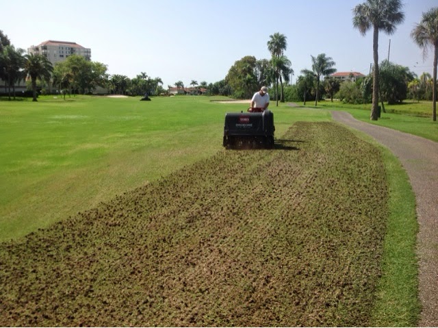 You may notice over the next few days that we have punched more aerification holes in select locations. Yes, our last major aerification was two weeks ago but as part of our ongoing maintenance program we continue to focus on key areas that will benefit from additional aerification. Most of these locations are areas that receive heavy cart traffic resulting in compacted soils. Aerification of these areas promotes stronger plants to better withstand traffic. Other key areas receiving supplemental aerification are some of the sandier spots with poorer soil quality. Following the aerification of these areas, an organic fertilizer will be applied to improve soil structure and water retaining ability as well as important nutrients for the grass.